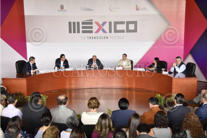 CUERNAVACA, MORELOS, 24AGOSTO2017.- Graco Ramírez, Gobernador del Estado de Morelos; Silvano Aureoles, Gobernador de Michoacán; Rafael Moreno Valle, ex Gobernador del Estado de Puebla; Alejandra Barrales, Presidenta del Partido de la Revolución Democrática, y Guadalupe Acosta Naranjo, diputado por la LXIII Legislatura, durante su partipación de la mesa "Gobierno de Coalición:¿Cambio de Régimen en México?" como parte del Coloquio "La transición posible" celebrado en el Centro Cultural Teopanzolco. En el foro se discutieron los elementos clave para la elección del candidato del Frente Amplio Democrático rumbo a las elecciones electorales de 2018.. FOTO: MARIO JASSO /CUARTOSCURO.COM