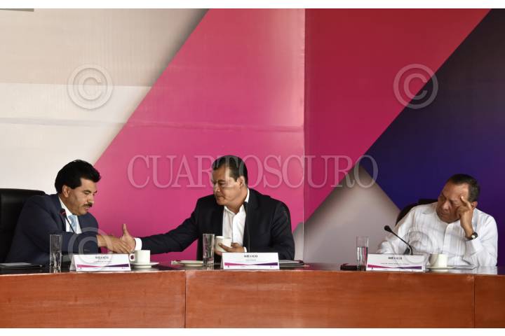 CUERNAVACA, MORELOS, 24AGOSTO2017.- José Ramón Enriquez, presidente Municipal de Durango, Juan Zepeda, ex candidato a la gubernatura del Estado de México por el PRD, y el diputado Jesús Zambrano, durante la mesa "Pensar en México en el 2018" como parte del Coloquio "La transición posible" celebrado en el Centro Cultural Teopanzolco. En el foro se discutieron los elementos clave para la elección del candidato del Frente Amplio Democrático rumbo a las elecciones electorales. FOTO: MARIO JASSO /CUARTOSCURO.COM
