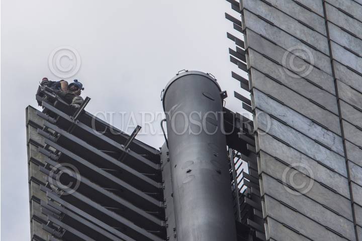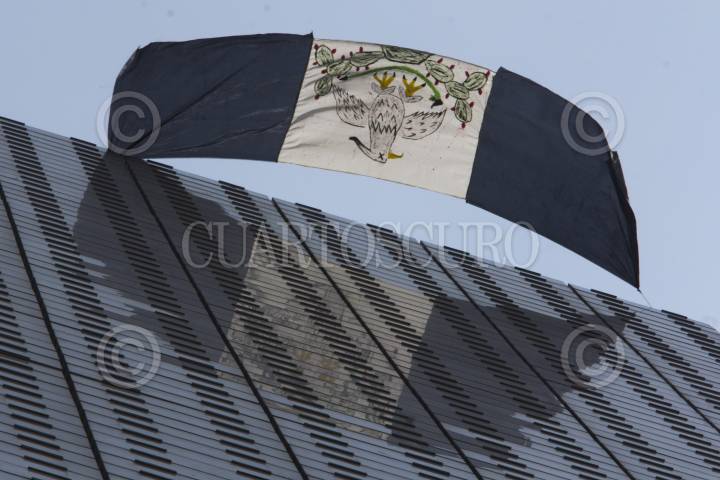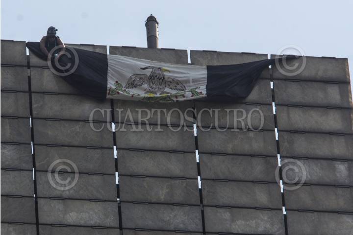 MÉXICO, D.F., 24FEBRERO2014.- Un joven, escalo a la punta de la estela de Luz donde mostró una bandera en forma de protesta. FOTO: ENRIQUE ORDÓÑEZ /CUARTOSCURO.COM