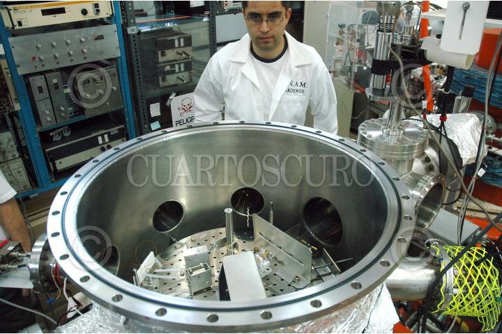 CUERNAVACA, MORELOS.- 06FEBRERO2008.- Un investigador muestra una cámara de impresión de partículas en el laboratorio de plasmas fríos del Instituto de Ciencias Físicas en el campus Morelos de la UNAM. FOTO: RODOLFO ANGULO/CUARTOSCURO.COM