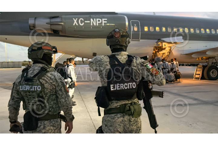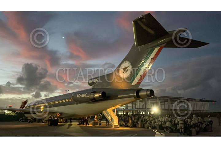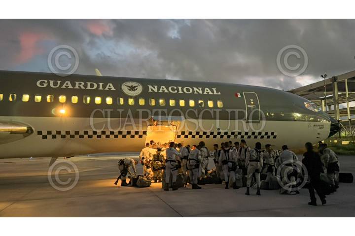 CANCÚN, QUINTANA ROO, 04FEBRERO2025.- Elementos de la Guardia Nacional partieron durante las primeras horas del aeropuerto de Cancún hacia la frontera norte a fin de reforzar los trabajos de seguridad tras los acuerdos entre el gobierno mexicano y estadounidense para evitar la aplicación del 25?aranceles. FOTO: ELIZABETH RUIZ/CUARTOSCURO.COM