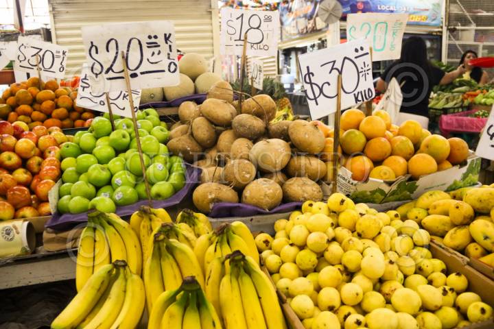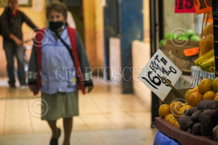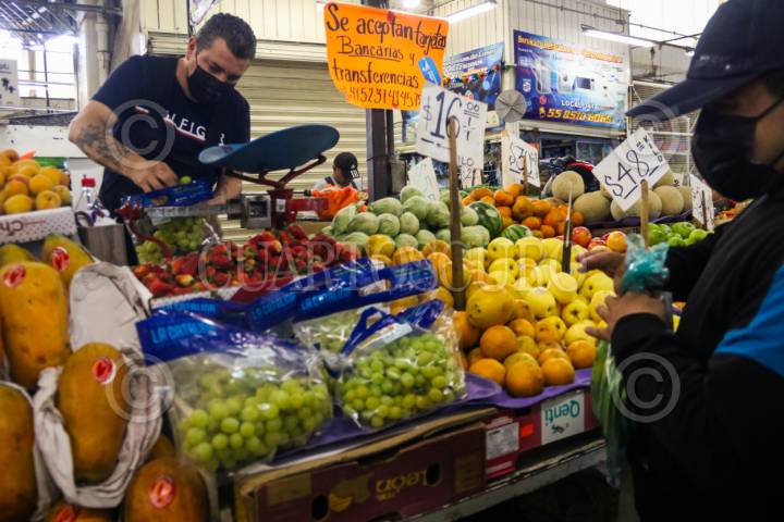 Un joven que trabaja en una frutería en el mercado Adolfo López Mateos atrae a los compradores gritando los precios de piñas, tunas, mangos y manzanas que oferta.