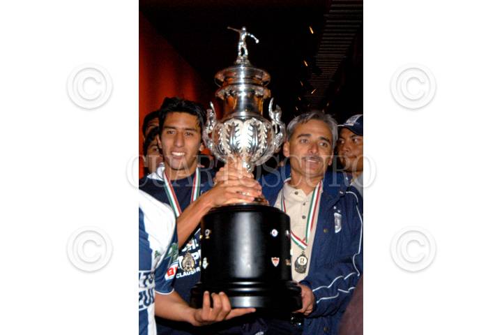 PACHUCA, HIDALGO 21MAYO2006.- El presidente del Club Pahuca, Jesús Martínez (derecha) sostiene la copa de campeón del torneo de clausura 2006. FOTO: Carlos Guzmán/CUARTOSCURO.COM