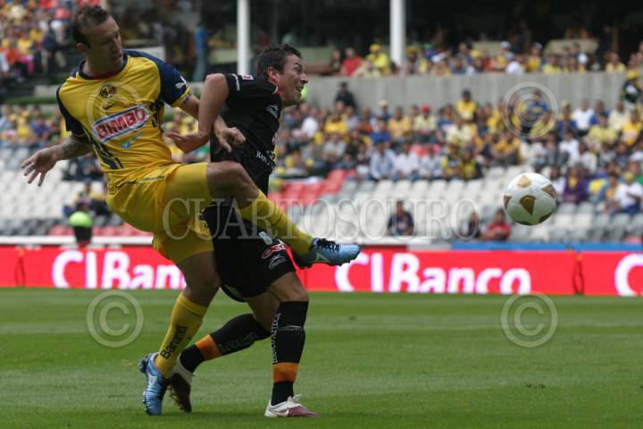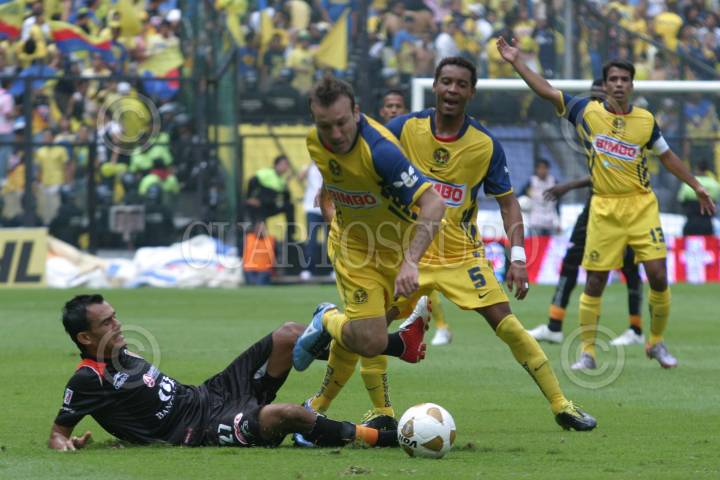 MÉXICO, D.F., 01AGOSTO2010.- Vicente Matías Vuoso, jugador de las Águilas del América, se quita la marca de Diego Ordáz, jugador de Jaguares de Chiapas, para anotar el primer gol en el partido de la jornada 2 del torneo Apertura 2010 donde El América venció 3 goles a cero a los jaguares de Chiapas. FOTO: IVAN STEPHENS/CUARTOSCURO.COM