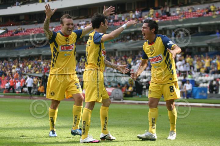 MÉXICO, D.F., 01AGOSTO2010.- Los jugadores del América Vicente Matías Vouso, Vicente Sánchez, y José Martínez festejan la segunda anotación en el partido de la jornada 2 del torneo Apertura 2010 donde el América venció 3 goles a cero a los jaguares de Chiapas. FOTO: IVAN STEPHENS/CUARTOSCURO.COM