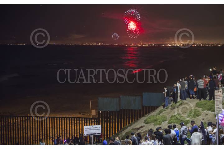 TIJUANA, BAJA CALIFORNIA, 04JULIO2017.- Celebración del Día de la Independencia estadounidense de este lado de la frontera, donde cientos de personas acudieron a un costado del muro fronterizo ubicado en Playas de Tijuana con la intención de observar el espectáculo de fuegos artificiales que son lanzados a varios kilómetros de distancia en la bahía de San Diego. Al lugar asistieron una gran calidad de familias, muchas de ellas deportadas de Estados Unidos. FOTO: CHRISTIAN SERNA/CUARTOSCURO.COM.