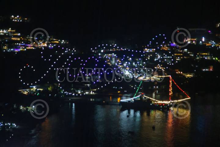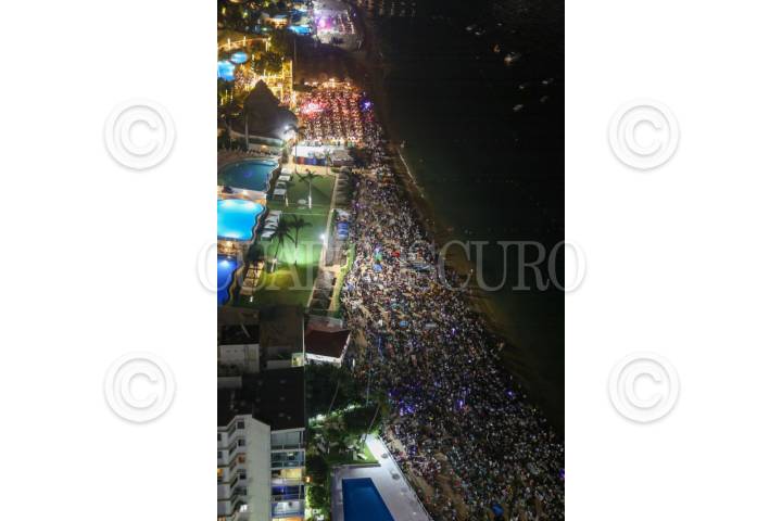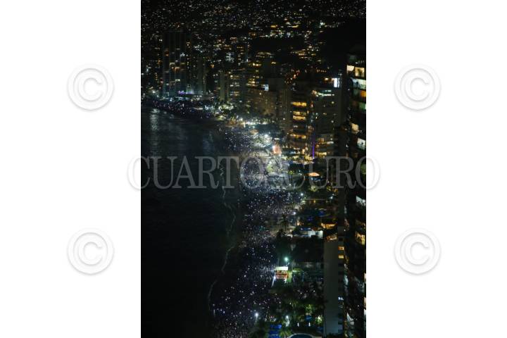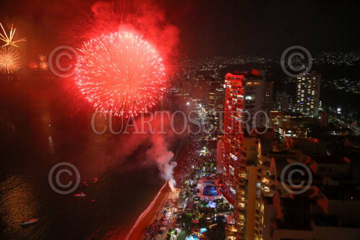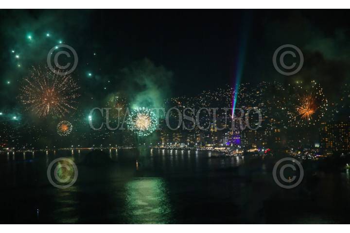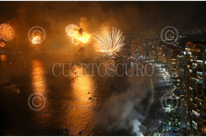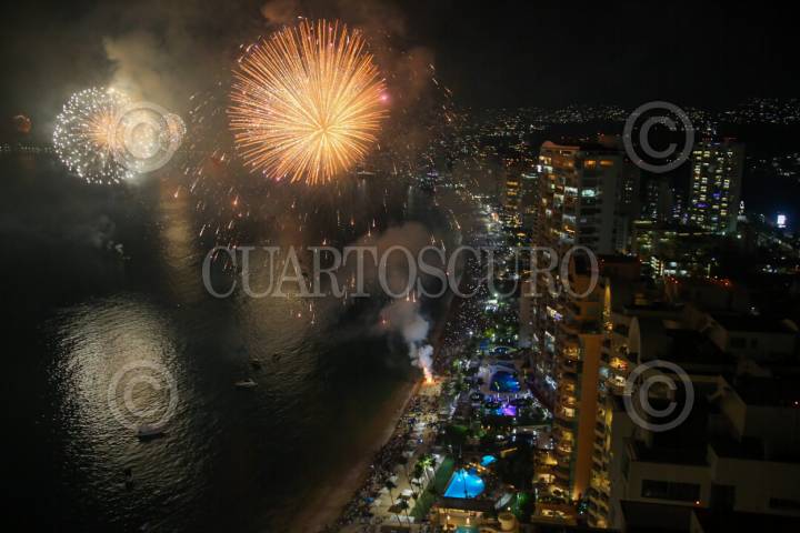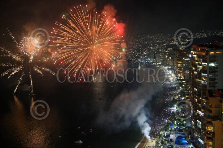 Con una gala de fuegos pirotécnico y de drones la Bahía de Acapulco recibió el año nuevo, miles de turistas abarrotaron las playas de este destino turístico.