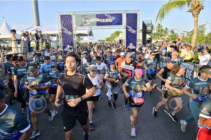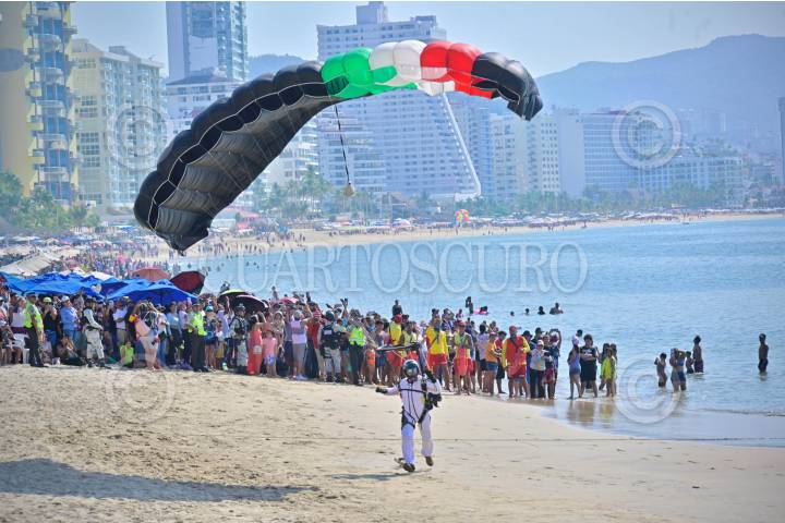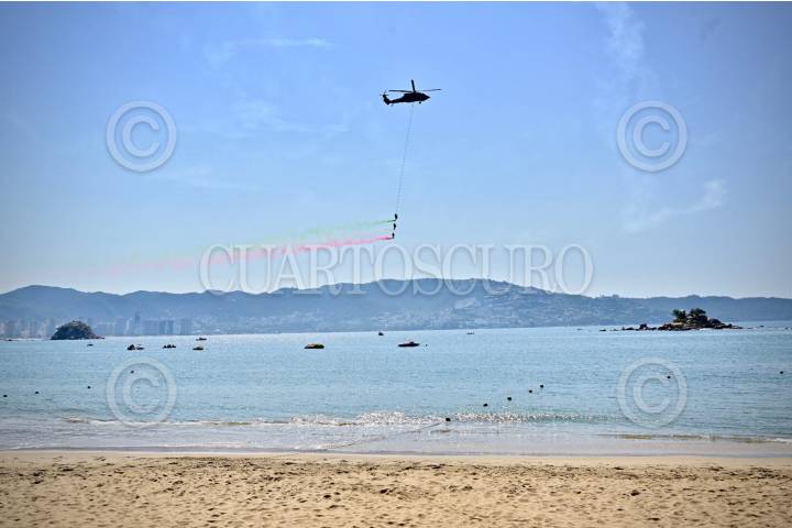 ACAPULCO, GUERRERO, 23FEBRERO2025.- Personal del Ejército, Fuerza Aérea y Guardia Nacional llevó a cabo la carrera deportiva y espectáculo aéreo “La Gran Fuerza de México” Guerrero 2025, como parte de las celebraciones del 10 de febrero “Día de la Fuerza Aérea” y 19 de febrero “Día del Ejército Mexicano”. La Carrera Deportiva dio inicio a las 07:30 horas con el banderazo de salida en la avenida costera Miguel Alemán de la cuidad de Acapulco. Como parte del programa, aeronaves de la Fuerza Aérea que integran la Escuadrilla Acrobática “Águilas Aztecas” compuesta por siete aviones T-6C+ “Texanos” y la Escuadrilla “Tigre” con dos aviones F-5 “Tiger II”, sobrevolaron el espacio aéreo, efectuando pases y maniobras, mostrando con ello un elevado grado de adiestramiento, habilidad y precisión que caracteriza a las y los pilotos que operan estas aeronaves. Personal de la Brigada de Fusileros Paracaidistas realizaron saltos de caída libre militar e integrantes del Cuerpo de Fuerzas Especiales desarrollaron una demostración de una operación aérea, la cual consistió en la técnica de maniobra de extracción de personal por medio de un helicóptero. FOTO: SEDENA/CUARTOSCURO.COM