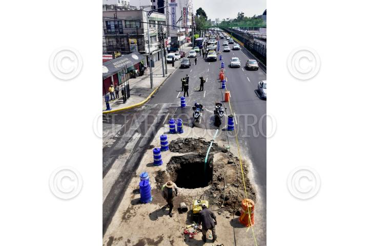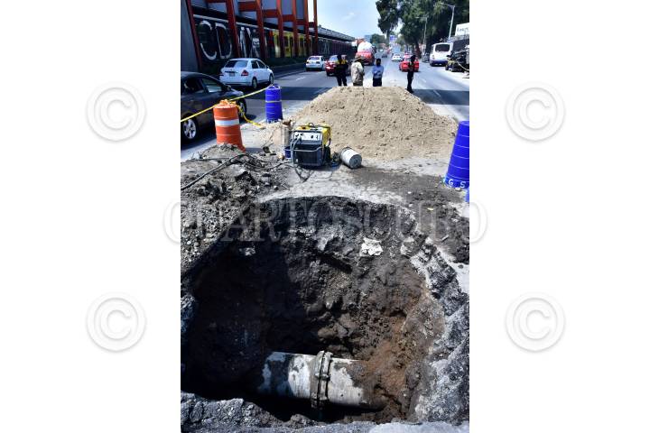 Trabajadores del gobierno capitalino trabajan reparando un socavón provocado por una fuga de agua sobre avenida Eje 1 Alzate, en la colonia Guerrero.