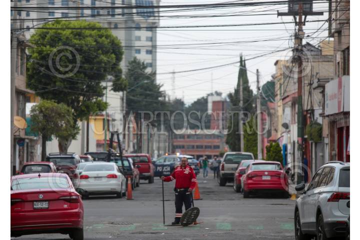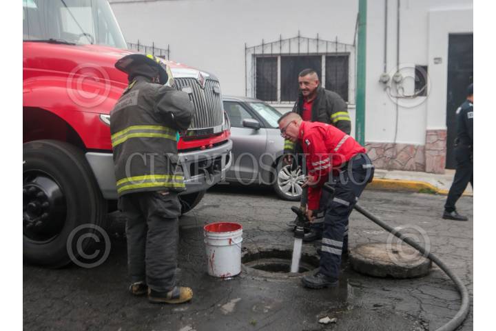TOLUCA, ESTADO DE MÉXICO, 11AGOSTO2025.- Elementos de PC y Bomberos de Toluca cerraron al menos tres cuadras de la colonia Vértice, por el reporte de un olor inusual a gas, procediendo a una revisión en los diferentes domicilios, revisión y lavado de drenaje para descartar fugas o acumulaciones que puedan representar algún riesgo. FOTO: CRISANTA ESPINOSA AGUILAR/CUARTOSCURO.COM