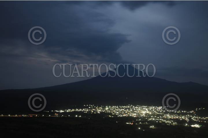El volcán Popocatépetl continúa con actividad moderada, la imagen tomada está noche desde San Nicolás de los Ranchos, Puebla.