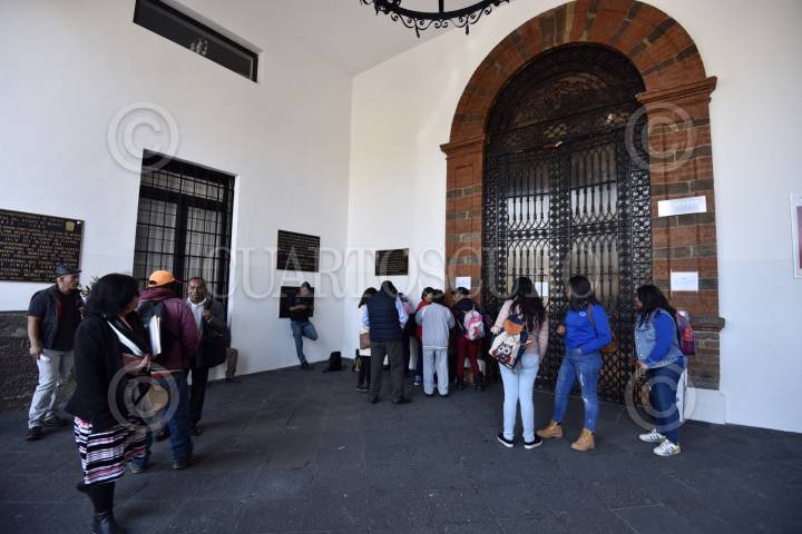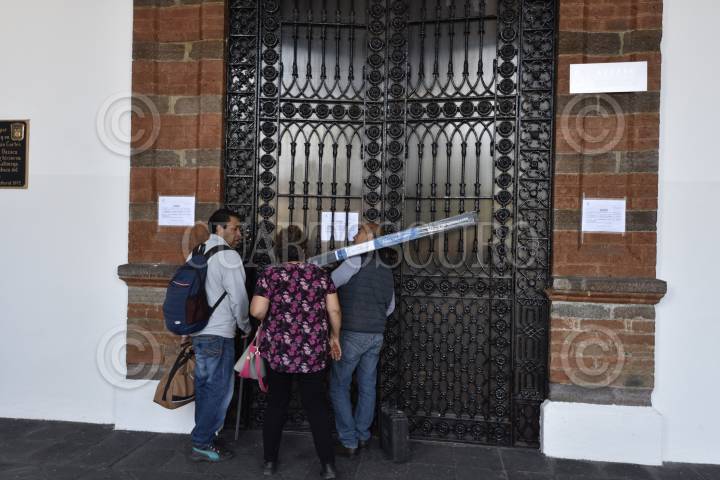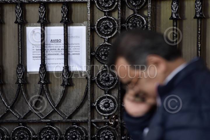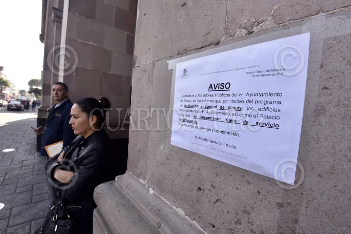 TOLUCA, ESTADO DE MÉXICO, 28FEBRERO2019.- Por varias horas fueron interrumpidas las actividades en el ayuntamiento de Toluca, trabajadores y ciudadanos que acudieron a realizar algún trámite encontraron un anuncio en donde informaban que estarían los edificios fuera de servicio por un programa de fumigación y control de plagas; el edificio fue cerrado previo a llevarse a cabo una diligencia de embargo por adeudo a una empresa de construcción. FOTO: ARTEMIO GUERRA BAZ /CUARTOSCURO.COM
