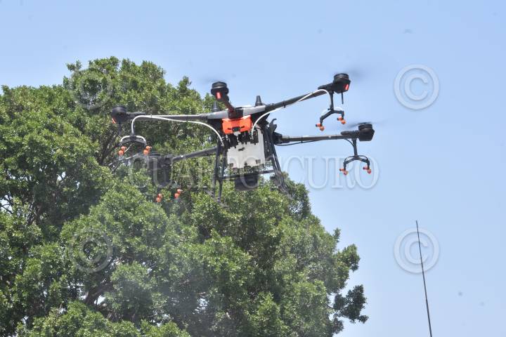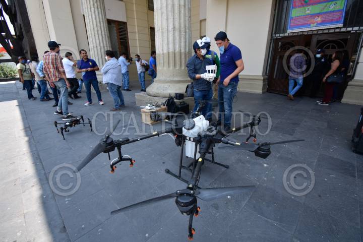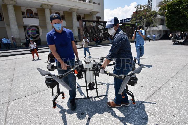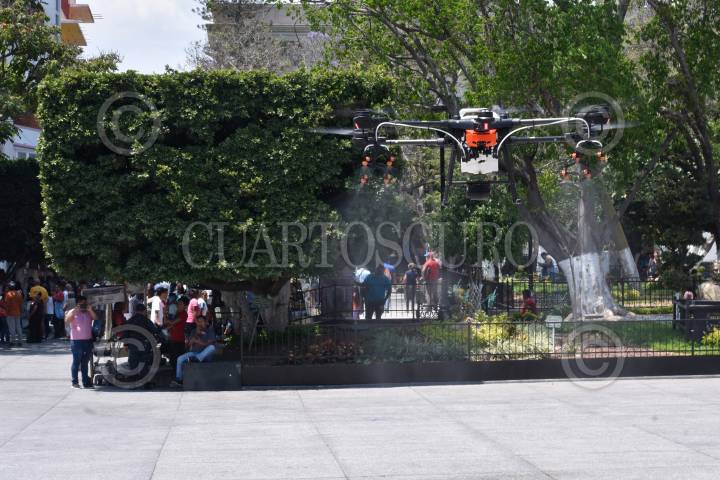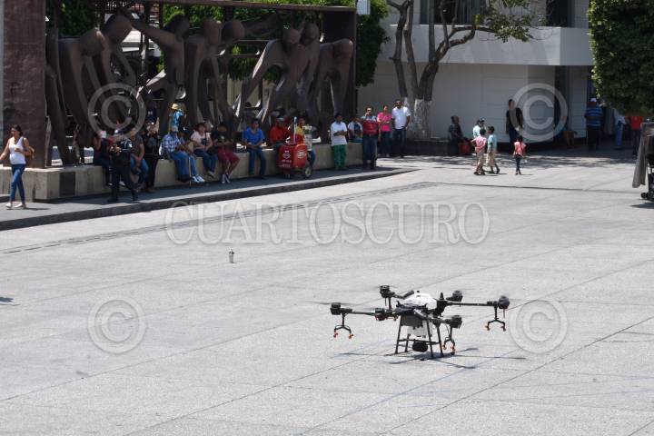Trabajos de Sanitización con drones en el centro de Chilpancingo ante la pandemia de Covid-19.