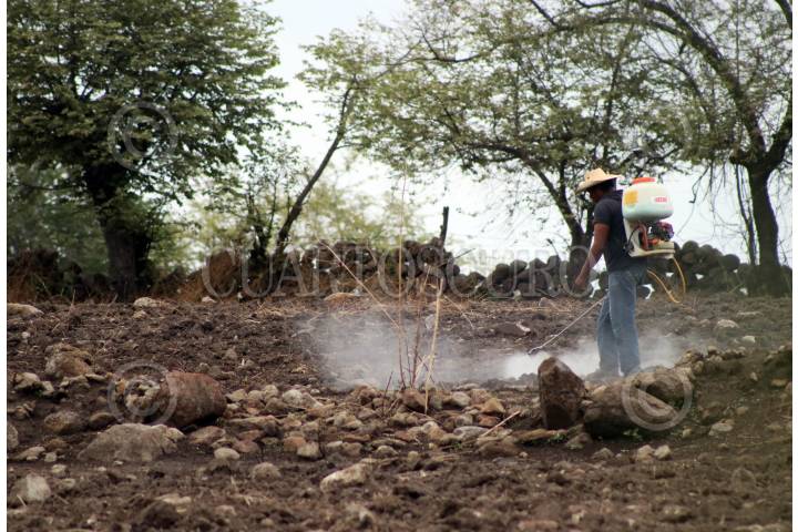 Peones fumigan una parcela antes de sembrarla en el municipio de Ayala.