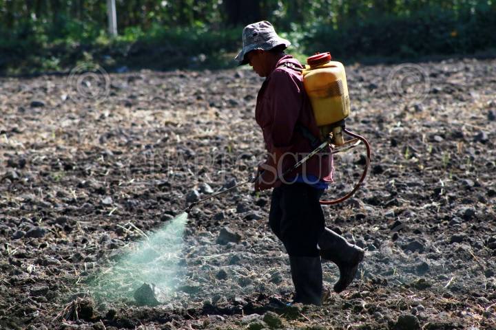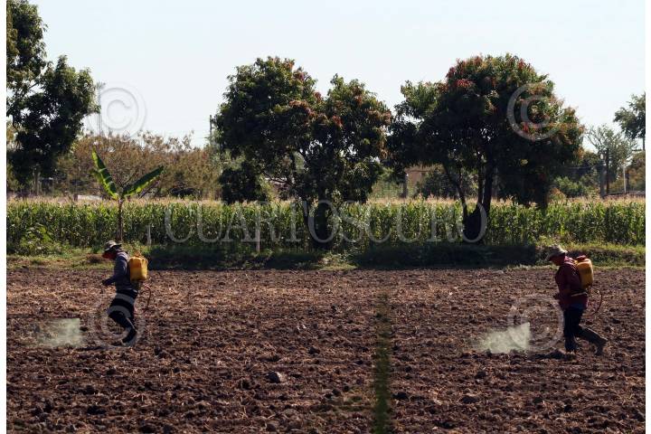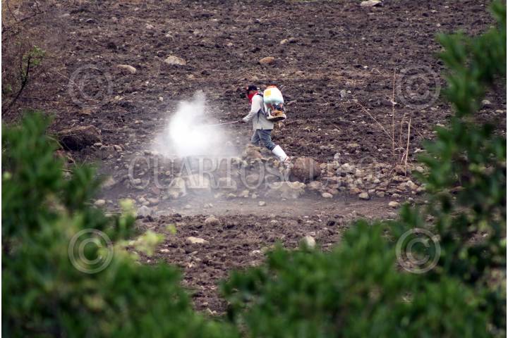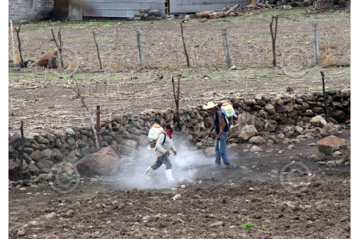 Campesinos fumigan su terreno ante la inminencia del temporal de lluvia.