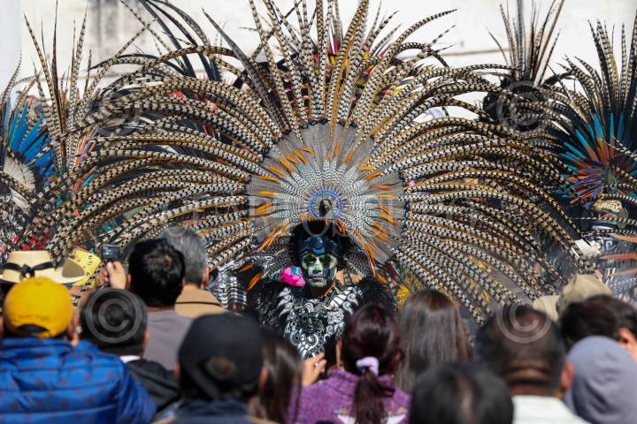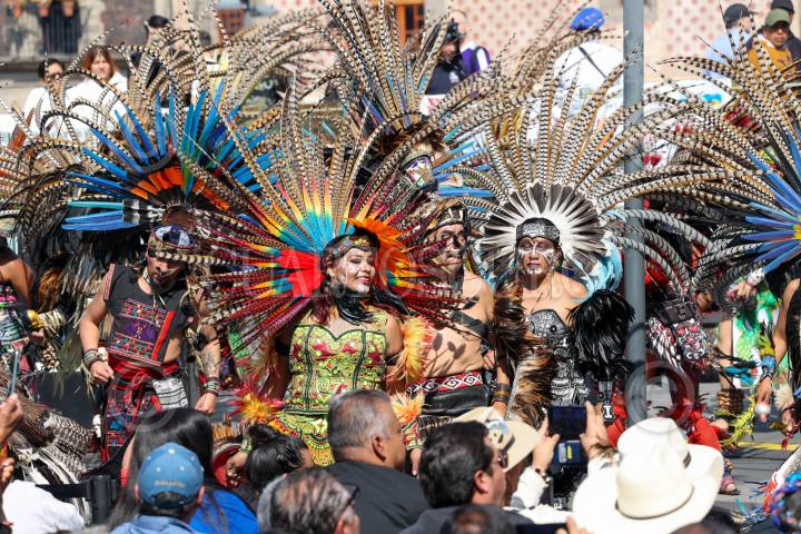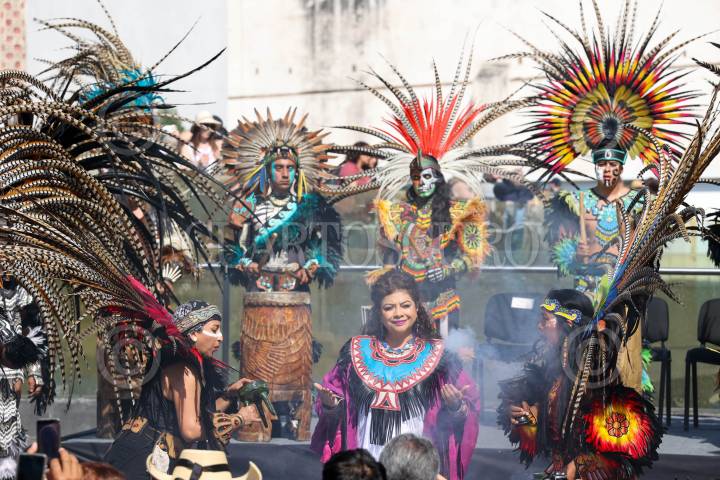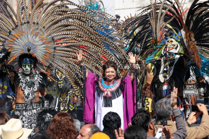 CIUDAD DE MÉXICO, 31DICIEMBRE2024.- Clara Brugada, Jefa de Gobierno, encabezó el Acto de Decreto del Año 2025 por los 700 años de la fundación de Tenochtitlan, en Plaza Seminario, la acompañaron danzantes prehispánicos, ahí realizaron un ceremonia purificadora con baile y canto. FOTO: MOISÉS PABLO/CUARTOSCURO.COM