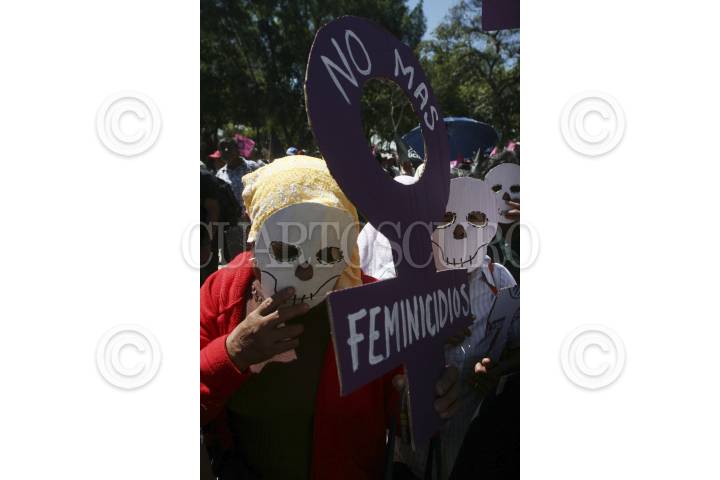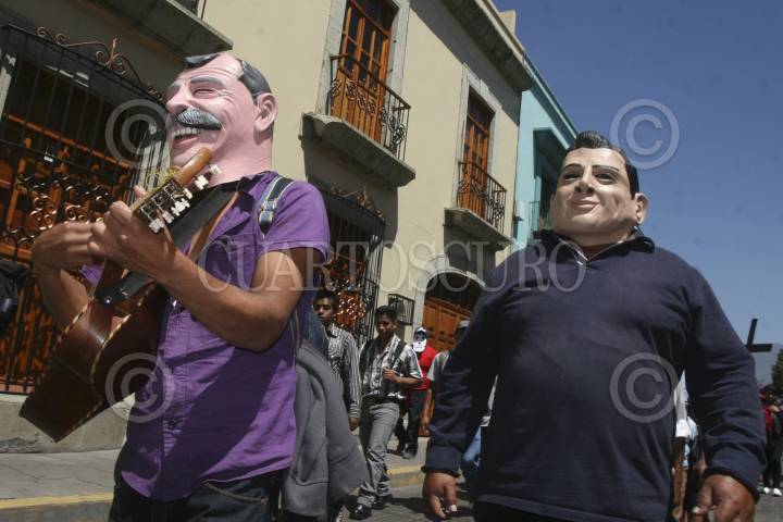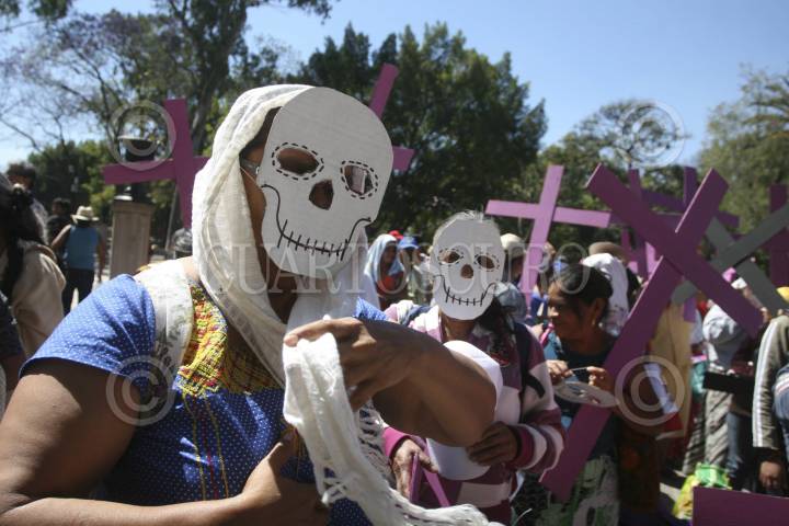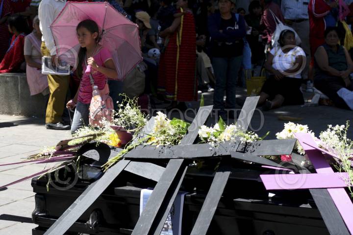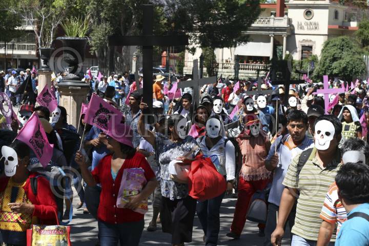 OAXACA, OAXACA, 19MARZO2013.- Indígenas provenientes de diversas regiones del estado participaron en un "cortejo fúnebre" realizado por la Unión de Comunidades Indígenas de la Zona Norte del Istmo. Con un ataúd a cuestas, cruces color morado y máscara de calavera marcharon del parque El Llano hacia el zócalo de la ciudad. FOTO: ARTURO PÉREZ ALFONSO /CUARTOSCURO.COM