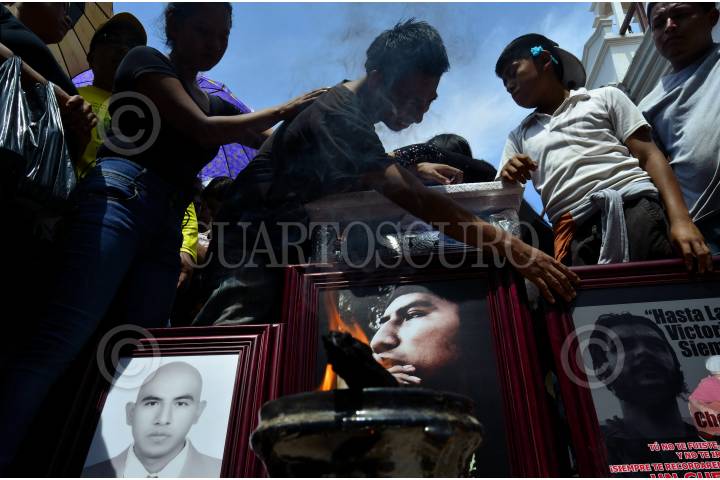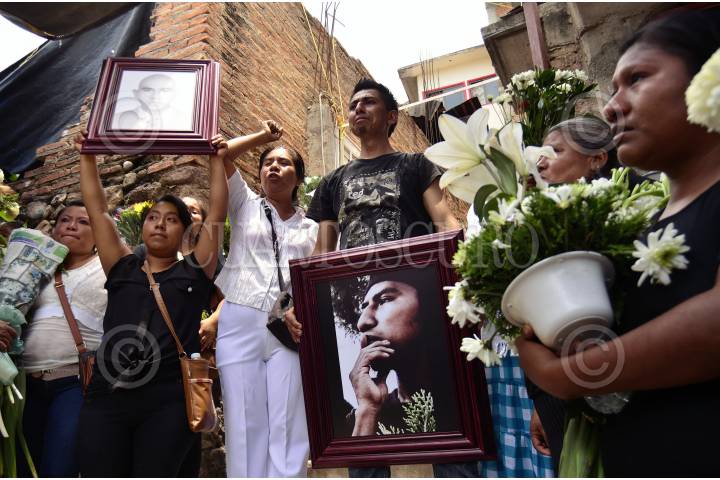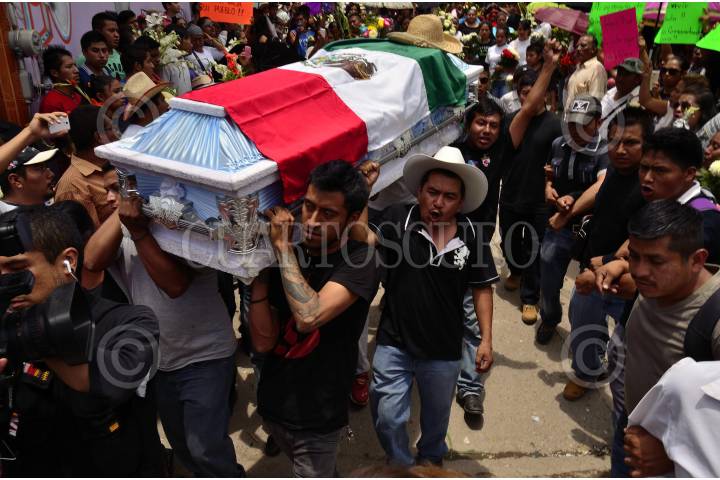 TLAPA, GUERRERO, 09JUNIO2015.- Miles de personas entre amistades, estudiantes, profesores, compañeros de lucha y sus familiares realizaron una marcha fúnebre con el cuerpo de Antonio Vivar Díaz, joven asesinado por policías federales el pasado domingo; su cuerpo fue presentado por última vez fue llevado al pasillo del ayuntamiento donde dio su lucha por ochos meses para exigir la presentación con vida de los 43 normalistas desaparecidos, minutos después trasladado a la catedral de San Agustín en donde se realizó la misa de cuerpo presente. FOTO: SALVADOR CISNEROS SILVA /CUARTOSCURO.COM