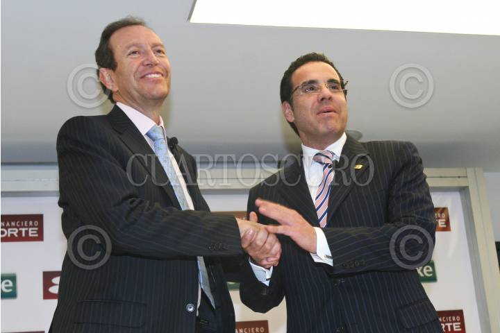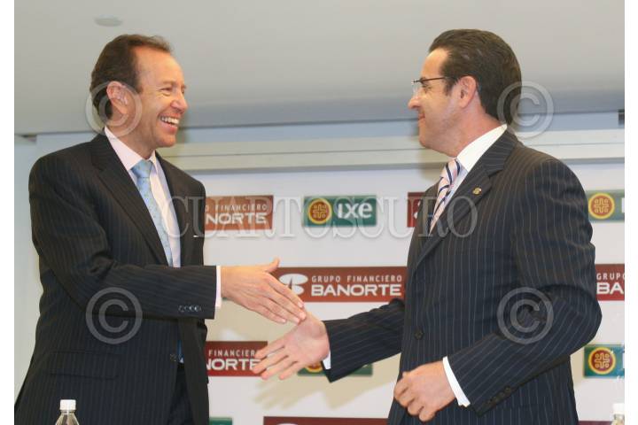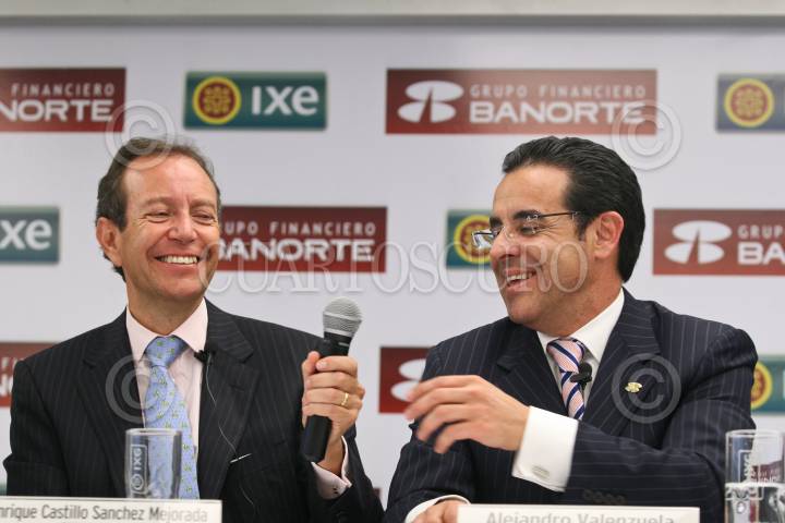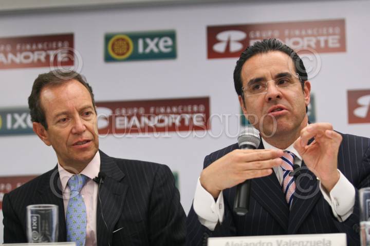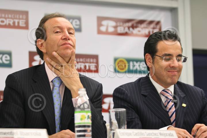 MÉXICO, D.F., 17NOVIEMBRE2010.- Enrique Castillo Sánchez Mejorada, presidente ejecutivo de Ixe, y Alejandro Valenzuela, director general de Grupo Financiero Banorte, ofrecieron conferencia de prensa para anunciar la fusión de las dos instituciones bancarias. FOTO: ISAAC ESQUIVEL/CUARTOSCURO.COM