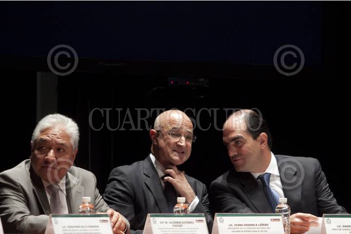 MÉXICO, D.F., 06DICIEMBRE2011.- Valdemar Gutiérrez Fragoso, líder del sindicato del IMSS, Pedro Ordorica Leñero, titular de la Comisión Nacional del Sistema del Ahorro para el Retiro, y Daniel Karam Tomeuh, director del Instituto Mexicano del Seguro Social, firmaron un convenio para fusionar Afore XXI y Afore Banorte, la ceremonia se realizó en las instalaciones del seguro social. FOTO: MOISÉS PABLO/CUARTOSCURO.COM