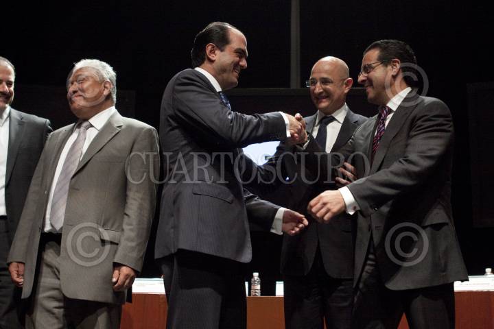 MÉXICO, D.F., 06DICIEMBRE2011.- Valdemar Gutiérrez Fragoso, líder del sindicato del IMSS, Daniel Karam Tomeuh, director del Instituto Mexicano del Seguro Social, Pedro Ordorica Leñero, titular de la Comisión Nacional del Sistema del Ahorro para el Retiro, y Alejandro Valenzuela del Río, director general de Grupo Finaciero Banorte, al finalizar la conferencia en la cual se anunció la fusión de Afore XXI y Afore Banorte, la ceremonia se realizó en las instalaciones del seguro social. FOTO: MOISÉS PABLO/CUARTOSCURO.COM