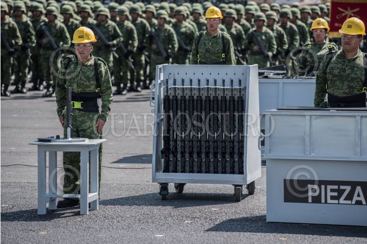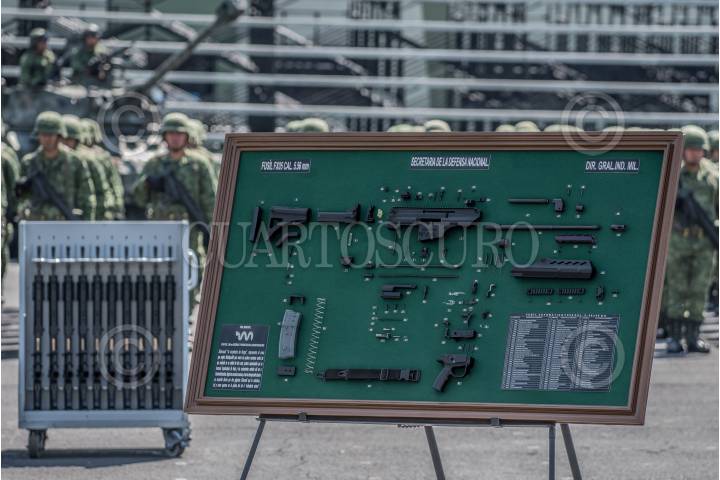 CIUDAD DE MÉXICO, 22NOVIEMBRE2018.- Se llevo a cabo la ceremonia con motivo del cumplimiento de la meta sexenal “Producción de 121,000 Fusiles FX-05 CAL. 5.56 mm.”, realizada en la explanada Damián Carmona del Primer Cuerpo de Ejército del Campo Militar Número 1-A. La arma tiene el nombre de Xiuhcoatl "La serpiente de fuego" y es de completa fabricación mexicana realizada por la Secretaría de la Defensa Nacional (SEDENA), y está categorizada como un fusíl automático con un calíbre de 5,56 por 45 mm. FOTO: MARIO JASSO /CUARTOSCURO.COM