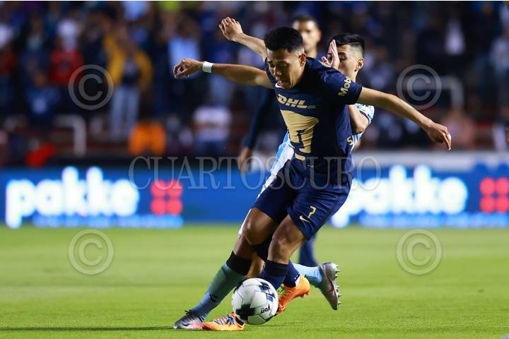 Kevin Balanta e Higor Meritao , durante el partido de la jornada 2 del torneo Grita México Clausura 2022 de la Liga BBVA MX, entre los Gallos Blancos del Querétaro y los Pumas de la UNAM, celebrado en el estadio La Corregidora.