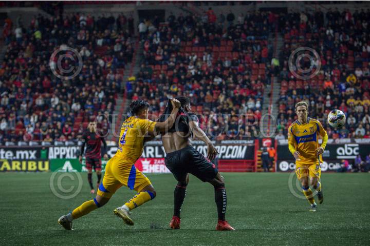 TIJUANA, BAJA CALIFORNIA, 1NOVIEMBRE2024.- Jesus Garza de los Tigres jalando la camisa de Raúl Zuñiga. Xolos de Tijuana sufrió una dolorosa derrota en casa al caer 3-0 frente a Tigres en la jornada 15 del fútbol mexicano, un resultado que complica su posición en la tabla. La derrota mantiene a Tijuana en el quinto lugar, con 25 puntos, y en los lugares de clasificación directa a la “fiesta grande”, con solo dos jornadas restantes. Este revés también rompe el invicto de Xolos como local, una racha que había sido clave en su buen desempeño a lo largo del torneo. La afición en el Estadio Caliente se mostró desconcertada tras ver a su equipo perder por primera vez como local en el torneo, y de manera contundente. Ahora, el conjunto fronterizo buscará recomponer el camino el próximo 6 de noviembre, cuando enfrenten a Juárez como visitantes, en un duelo crucial para mantenerse en la pelea por la liguilla y mantener vivas sus esperanzas de clasificación. FOTO: CHRIS NOYOLA/ CUARTOSCURO.COM