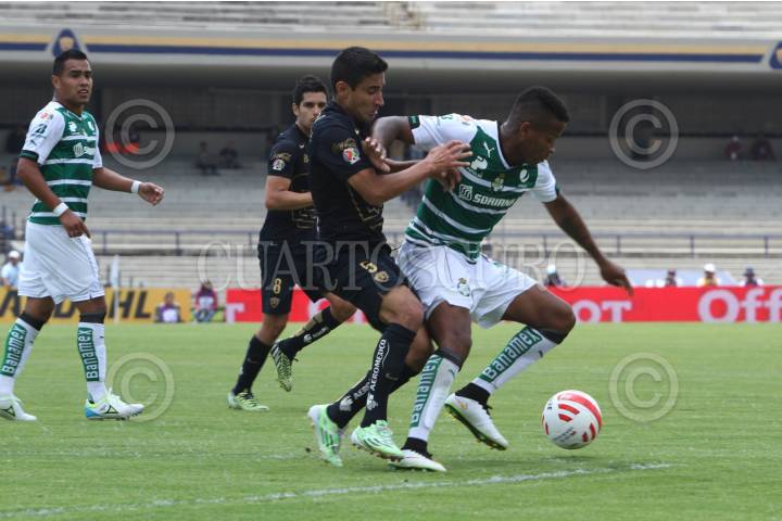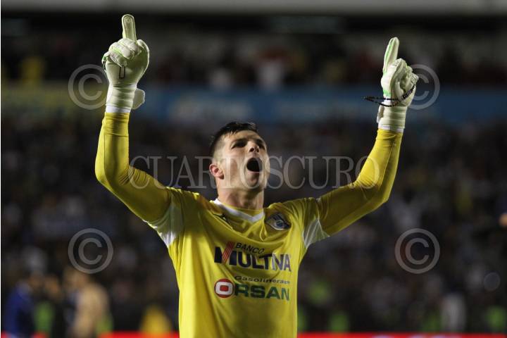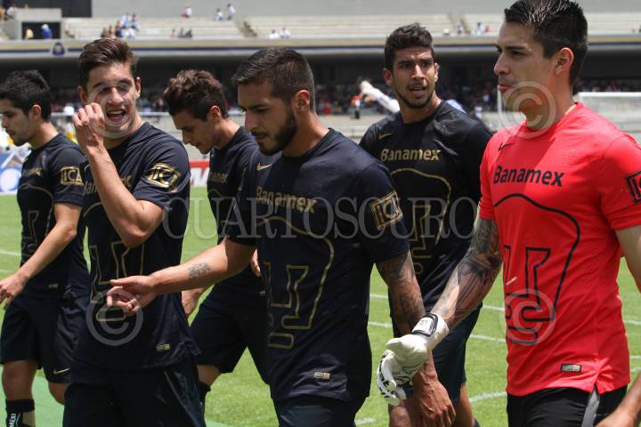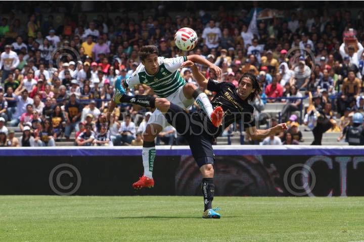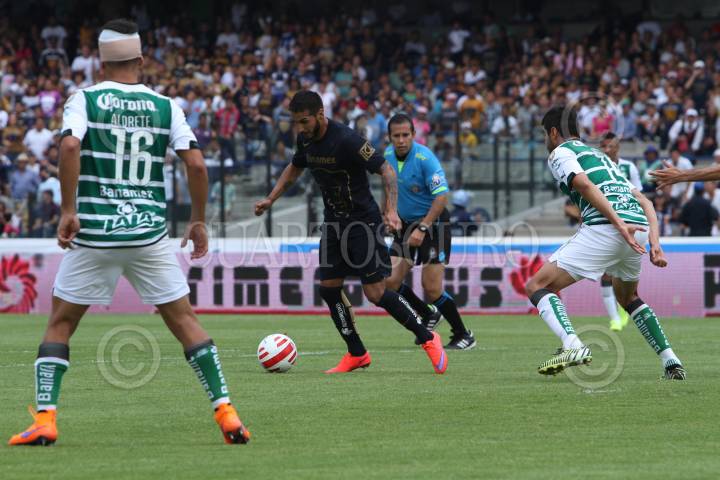 MÉXICO, D.F., 19ABRIL2015.- En la Jornada 14 del torneo de Clausura 2015 de la Liga Bancomer MX, Gerardo Alcoba le da la victoria a los Pumas de Ciudad Universitaria, con un remate de cabeza de un tiro de esquina, que el portero de los Santos Laguna, Marchesin no logro detener. Con esta victoria el equipo Auriazul se coloca en la posición numero 10. FOTO: ISABEL MATEOS /CUARTOSCURO.COM