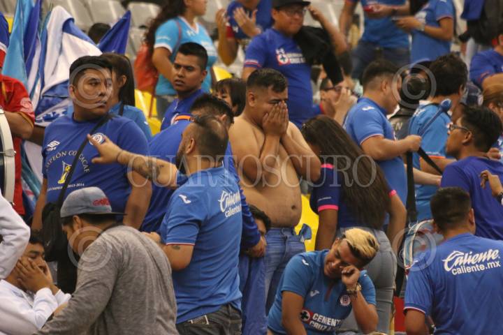 CIUDAD DE MÉXICO, 12DEMAYO219.- Aficionados del Cruz Azul lloran en las gradas luego de que con un marcador global de 3-2 el Club América obtuviera su pase a semifinales dejando en el camino al Cruz Azul en cuartos de finales de la Liga BBVA Bancomer MX, partido disputado en el Estadio Azteca. FOTO: ROGELIO MORALES /CUARTOSCURO.COM