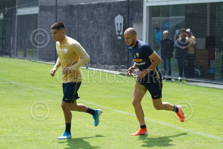 CIUDAD DE MÉXICO, 06AGOSTO2019.- Martín Barragán y Carlos González jugadores de los Pumas UNAM, durante el entrenamiento previo al encuentro ante el equipo de los Xolos de Tijuana. FOTO: ROGELIO MORALERS /CUARTOSCURO.COM
