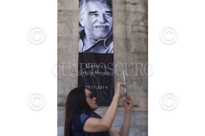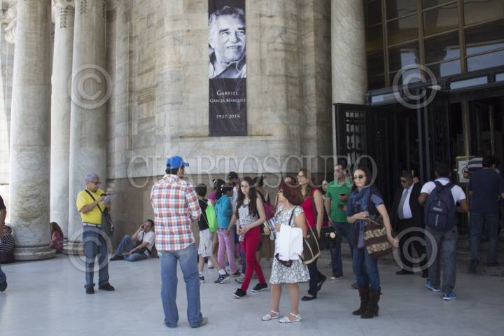 MÉXICO, DF., 20ABRIL2014.- En la entrada al Palacio de Bellas Artes, se pueden observar Fotografias de Gabriel Garcia Marquez, previo a el homenaje que se le realizara el dia de mañana. FOTO: ENRIQUE ORDÓÑEZ /CUARTOSCURO.COM