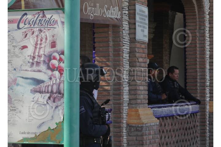 SALTILLO, COAHUILA 26JUNIO2012.- Elementos de la Policia Federal resguardan el restaurante donde Gabriel Quadri De La Torre, candidato presidencial de Nueva ALianza, realizó su conferencia de prensa y reunión con líderes locales y candidatos del PANAL. FOTO: JUAN PABLO ZAMORA /CUARTOSCURO.COM