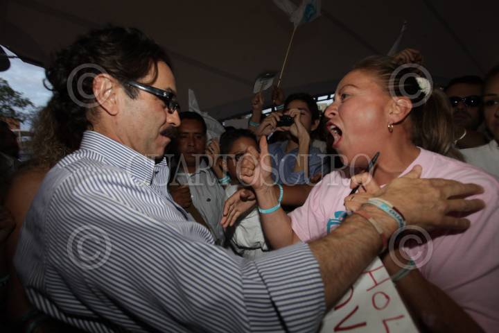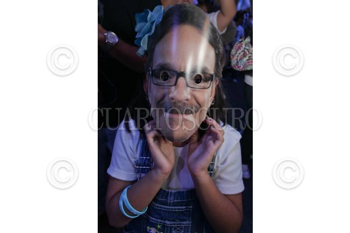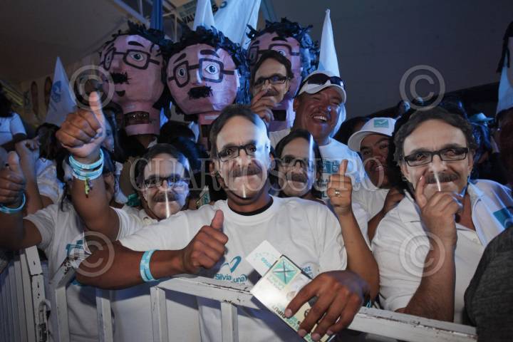 AGUASCALIENTES, AGUASCALIENTES 27 DE JUNIO2012.- La secretaría general de Nueva Alianza, Mónica Arreola Gordillo, e hija de la dirigente Magisterial Elba Esther Gordillo, sostiene una máscara de Gabriel Quadri De La Torre, candidato presidencial de Nueva Alianza, quien cerró su campaña en la explanada de la Plaza Patria de esta ciudad. FOTO: JUAN PABLO ZAMORA /CUARTOSCURO.COM