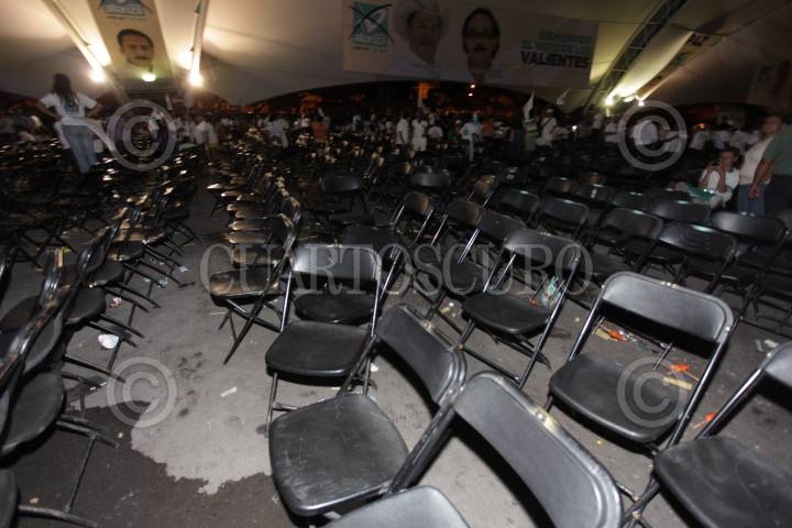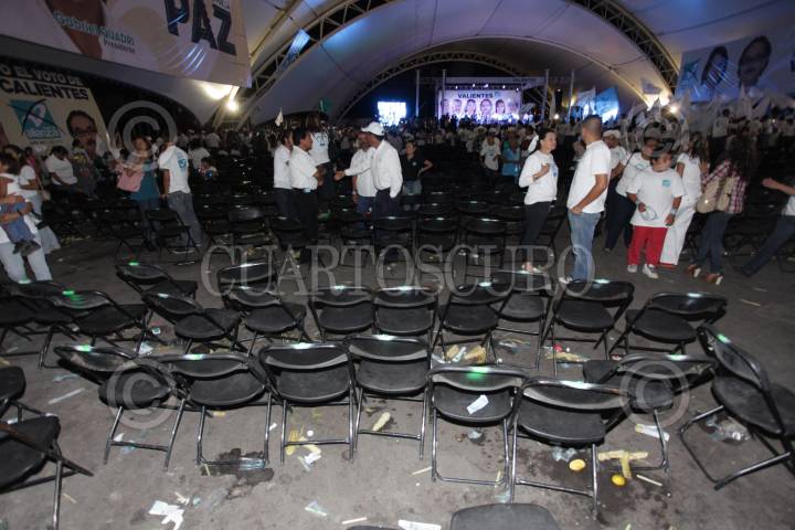 AGUASCALIENTES, AGUASCALIENTES 27 DE JUNIO2012.- Gabriel Quadri De La Torre, candidato presidencial de Nueva Alianza, cerró su campaña en la explanada de la Plaza Patria de esta ciudad, donde a pesar de las espectativas de que sería un lugar lleno, se observaron sillas vacias en el recinto y muchos asistentes salieron antes de que el candidato terminara de hablar. FOTO: JUAN PABLO ZAMORA /CUARTOSCURO.COM