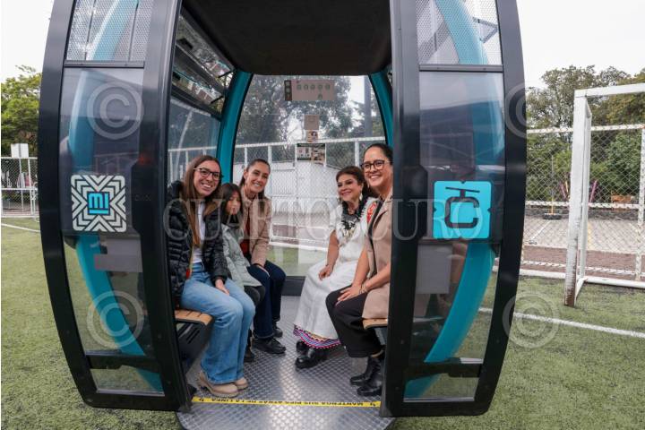 CIUDAD DE MÉXICO, 27JULIO2025.- Claudia Sheinbaum, Presidenta de México; Clara Brugada, Jefa de Gobierno, y Gabriela Osorio Hernández, alcaldesa de Tlalpan, durante la presentación del Proyecto Línea 4 del Cablebús, el cual recorrerá las alcaldías de Tlalpan y Coyoacán. Previo al protocolo oficial las mandatarias conocieron una de las capsulas de este transporte. FOTO: PRESIDENCIA/CUARTOSCURO.COM