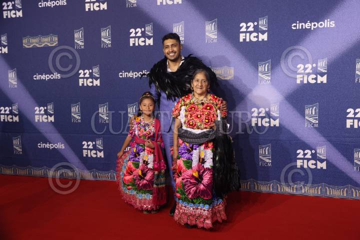 MORELIA, MICHOACÁN, 19OCTUBRE2024. Tenoch Huerta junto a las artesanas Leslie y Doña Feliciana a su paso por la alfombra roja y gala de la película “Pedro Páramo”, en su estreno como parte de las actividades del 22° Festival Internacional de Cine de Morelia, en el Teatro Mariano Matamoros. FOTO: EDGAR NEGRETE LIRA/CUARTOSCURO.COM
