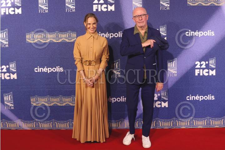 MORELIA, MICHOACÁN, 18OCTUBRE2024. Daniela Michel y el director Jacques Audiard a su paso por la alfombra roja de la gala inaugural del 22° Festival Internacional de Cine de Morelia, presentando la película “Emilia Pérez “. FOTO: EDGAR NEGRETE LIRA/CUARTOSCURO.COM
