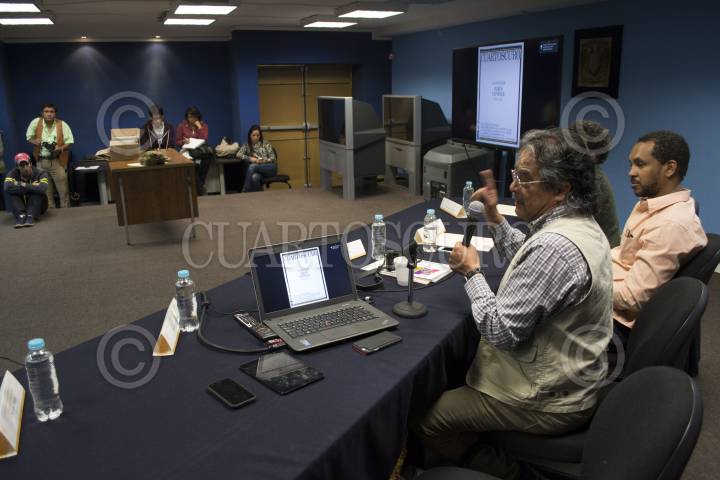 MÉXICO, D.F., 13NOVIEMBRE2015.- El fotoperiodista y director de la agencia Cuartoscuro, Pedro Valtierra, presentó el número 134 de dicha revista en compañía de la artista visual Gale Lynn, y el teórico y crítico de fotografía Juan Antonio Molina Cuesta. El evento se realizó en la sala de video conferencia de la Facultad de Arte y Diseño (FAD) de la Universidad Nacional Autónoma de México (UNAM). FOTO: MOISÉS PABLO /CUARTOSCURO.COM