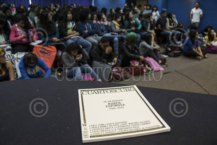 MÉXICO, D.F., 15OCTUBRE2015.- Pedro Valtierra, director de la revista y agencia Cuartoscuro realizo la presentación de la edición 134 de dicha revista, como un homenaje al fotoperiodista asesinado Rubén Espinosa, esto en compañía de la maestra Gale Lynn y el maestro Arturo Rosales en la galería Punctum, ubicada en la calle de Allende número 2 esquina con Donceles en la colonia Centro. En la imagen estudiantes de Guerrero denuncian la desaparición de su compañera Lucy. FOTO: GALO CAÑAS /CUARTOSCURO.COM