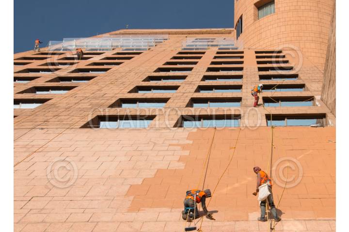 CIUDAD DE MÉXICO, 11FEBRERO2019.- Desde tempranas horas del día, media docena de trabajadores arriesgan su vida para dar mantenimiento a grandes edificios en la ciudad, un empleo que hasta hora es poco regulado, el cual es poco retribuido, mientras que en en países como Canadá limpiar un edificio puede costar 90,000 dólares, en México una empresa profesional cobra cerca de 70,000 pesos. FOTO: ROGELIO MORALES /CUARTOSCURO.COM