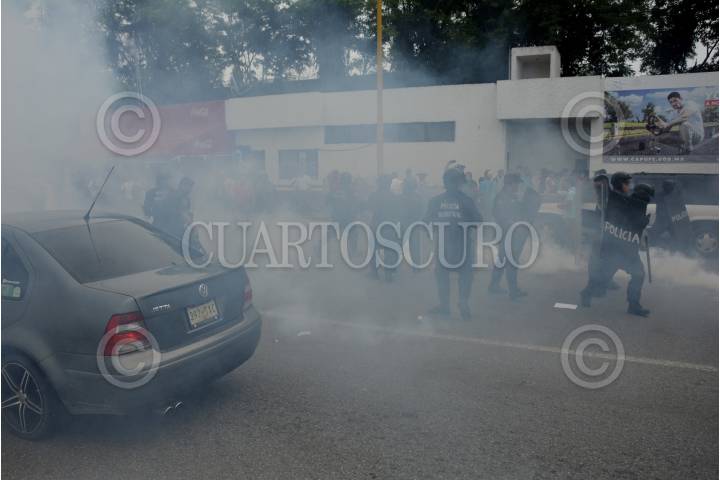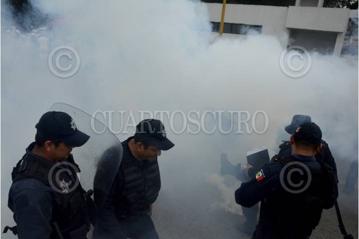 VILLAHERMOSA, TABASCO, 12OCTUBRE2015.- Educadores sindicalizados bloquearon las casetas de cobro sobre la autopista Villahermosa-Macuspana, donde también se enfrentaron con un grupo de antimotines de la Secretaria de Seguridad Publica local. En tal acción hubo detonaciones de gas lacrimógeno, e inclusive se dice que usaron balas de gomas los uniformados. FOTO MARCO POLO GUZMÁN HERNÁNDEZ /CUARTOSCURO.COM