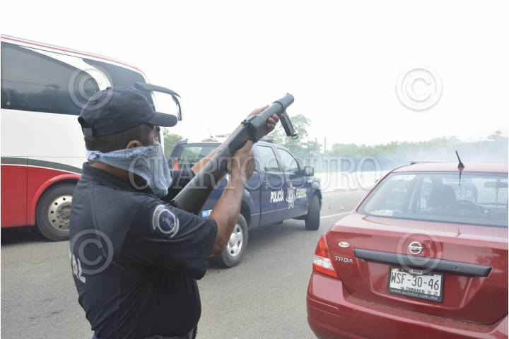 VILLAHERMOSA, TABASCO, 12OCTUBRE2015.-Educadores sindicalizados bloquearon las casetas de cobro sobre la autopista Villahermosa-Macuspana, donde también se enfrentaron con un grupo de antimotines de la Secretaria de Seguridad Publica local. En tal acción hubo detonaciones de gas lacrimógeno, e inclusive se dice que usaron balas de gomas los uniformados. FOTO MARCO POLO GUZMÁN HERNÁNDEZ /CUARTOSCURO.COM