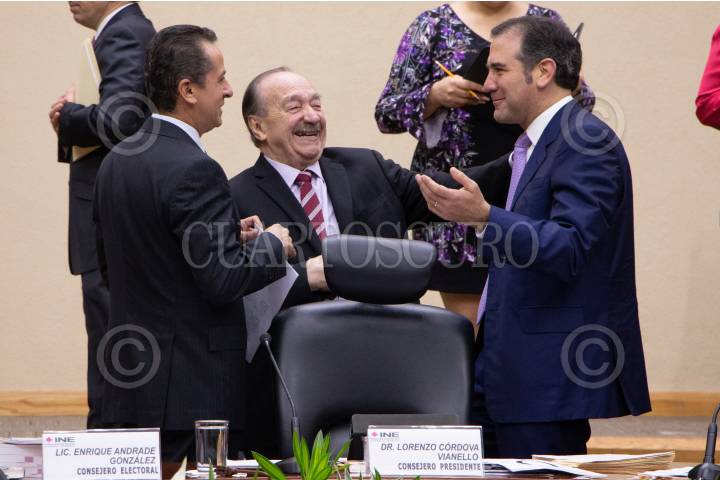 CIUDAD DE MÉXICO, 08JULIO2019.- Carlos Suárez, representante de Morena y Lorenzo Cordoba durante la sesión extraordinaria en donde se trató el tema de gastos no reportados durante elecciones ordinarias en los estados, en la sede del instituto. FOTO: ROGELIO MORALES /CUARTOSCURO.COM