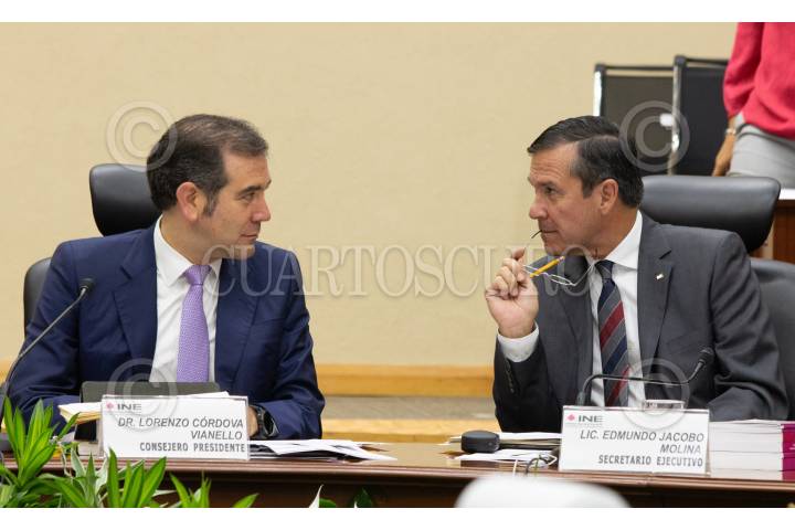 CIUDAD DE MÉXICO, 08JULIO2019.- Lorenzo Cordova, consejero presidente del INE y Jacobo Molina, secretario ejecutivo del INE, durante la sesión extraordinaria en donde se trató el tema de gastos no reportados durante elecciones ordinarias en los estados, en la sede del instituto. FOTO: ROGELIO MORALES /CUARTOSCURO.COM