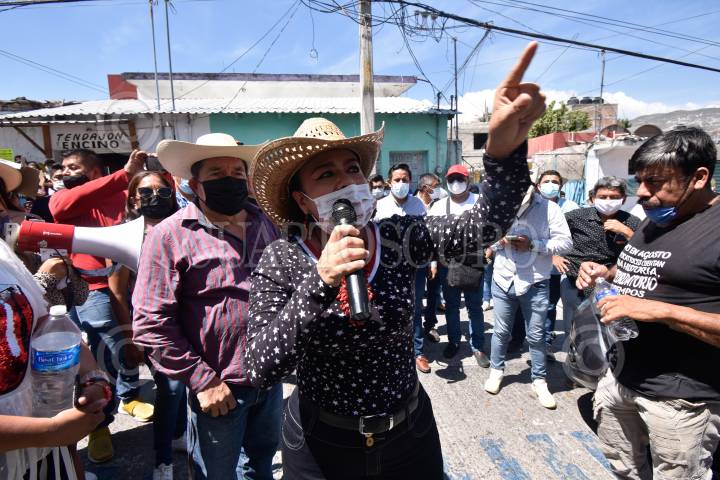Norma Otilia Hernández, candidata a la alcaldía de Chilpancingo por Morena, durante la protesta en las instalaciones del INE en rechazo a la cancelación de la candidatura de Félix Salgado Macedonio.