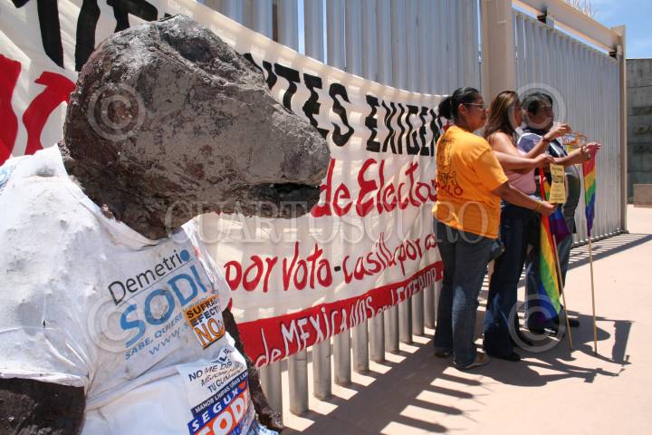 MÈXICO, D.F. 19JULIO2006.- Se llebò a cabo una manifestaciòn afuera del TRIFE. Asistieron integrantes de la comunidad gay. fuè expuesta una rata de latex con publicidad panista. FOTO: Paola Hidalgo/CUARTOSCURO.COM