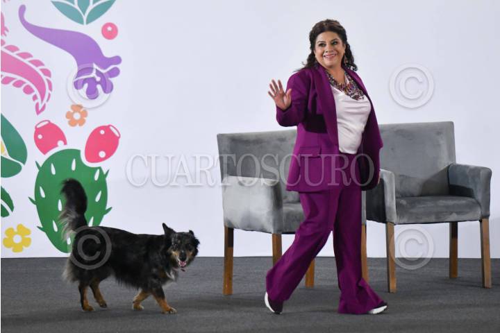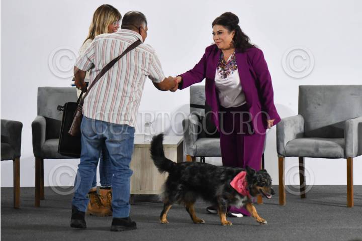 CIUDAD DE MÉXICO, 15JULIO2025.- Clara Brugada, jefa de Gobierno, acompañada de su animal de compañía "Iztli" encabezó la reunión "Zócalo de Gobierno Ciudadano" en la que escuchó las demandas sociales de algunos capitalinos. FOTO: MARIO JASSO/CUARTOSCURO.COM