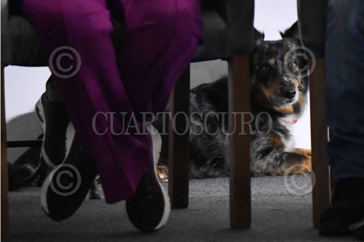 CIUDAD DE MÉXICO, 15JULIO2025.- "Iztli" animal de compañía de Clara Brugada, jefa de Gobierno, espera detrás de su dueña mientras se realiza la reunión "Zócalo de Gobierno Ciudadano" en la que se escuchan las demandas sociales de algunos capitalinos. FOTO: MARIO JASSO/CUARTOSCURO.COM