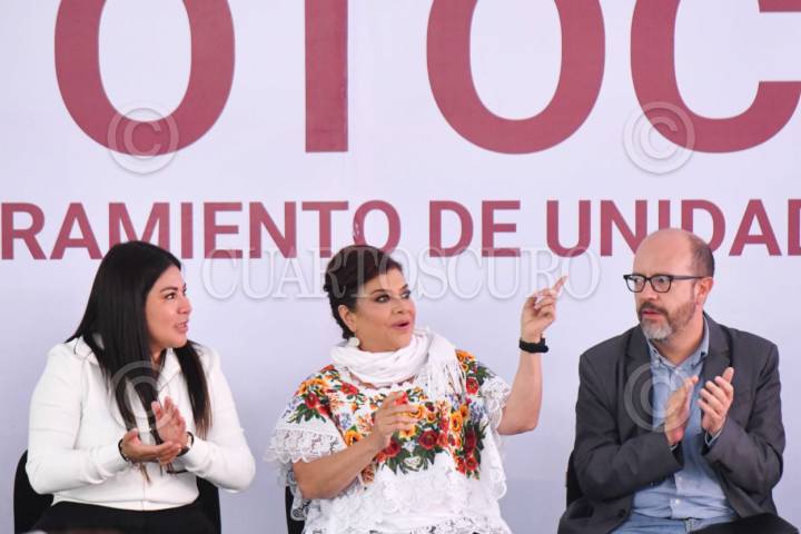 CIUDAD DE MÉXICO, 21AGOSTO2025.- Lourdes Paz Reyes, alcaldesa de Iztacalco; Clara Brugada, jefa de Gobierno, e Inti Muñoz Santini, secretario de Vivienda, durante la presentación del programa "Otoch" para el mejoramiento de unidades habitacionales, que en esta ocasión arrancó en la unidadInfonavit Iztacalco. FOTO: MARIO JASSO/CUARTOSCURO.COM